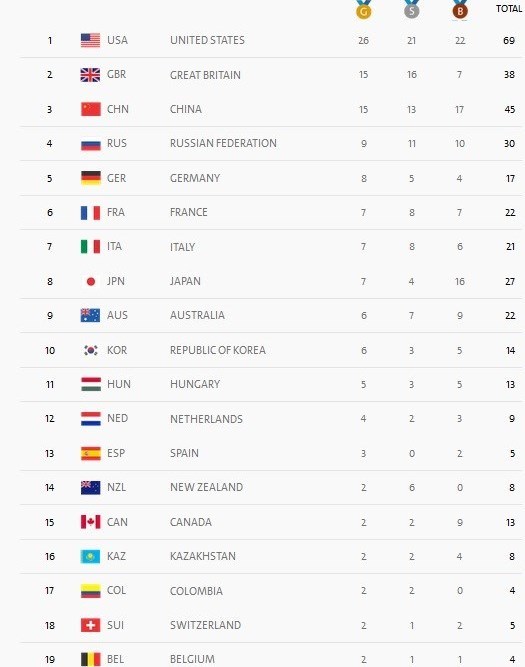 هم اکنون در جدول مدالی تیم آمریکا با 26 طلا، 21 نقره و 22 برنز همچنان در صدر است، بریتانیا با 15 طلا، 16 نقره و 7 برنز در رده دوم ایستاده و چین با 15 طلا، 13 نقره و 17 برنز به رده سوم سقوط کرده است.