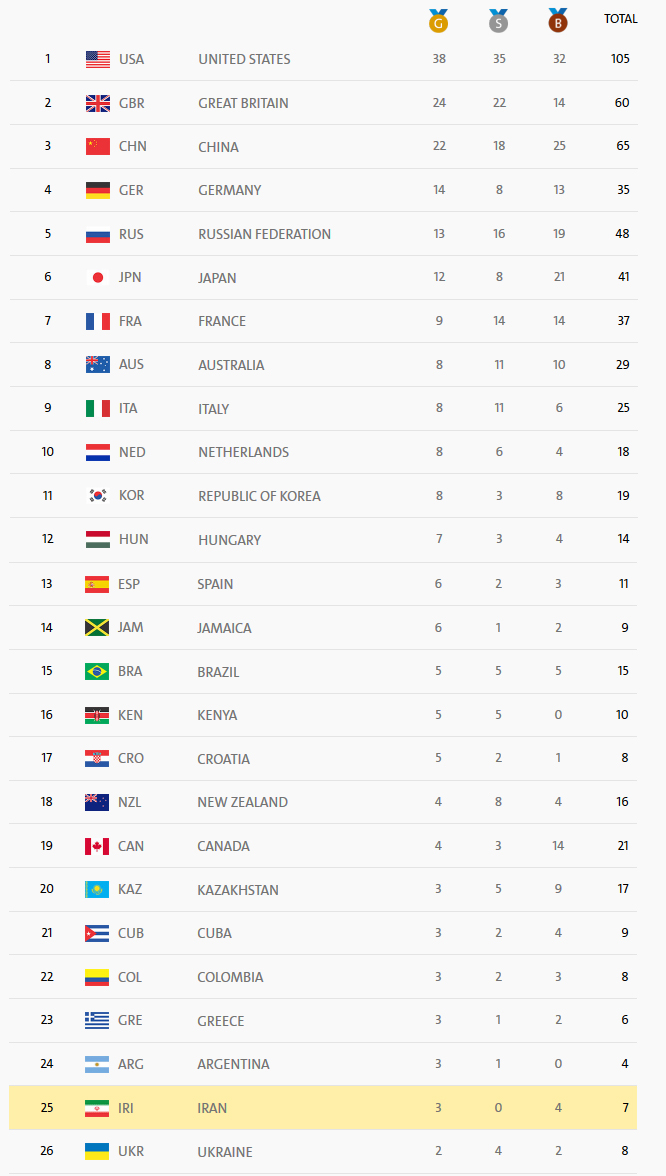 در جدول مدالی تیم آمریکا همچنان صدرنشین است، بریتانیا با 24 طلا در رده دوم ایستاده و چین با 22 طلا در تعقیب این تیم است.