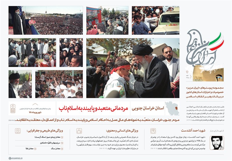 در سالروز سفر حضرت آیتالله خامنهای به استان خراسان جنوبی، در شهریورماه 1378 نهمین پوستر از مجموعه پوسترهای «ایرانِ عزیز» را با موضوع سفرهای استانی رهبر انقلاب اسلامی منتشر میکند. این پوستر تنها جلوهی کوچکی از خاطرات بهیادماندنی دیدار حضرت آیتالله خامنهای و مردم شهرهای مختلف و اقشار گوناگون استان خراسان جنوبی است...