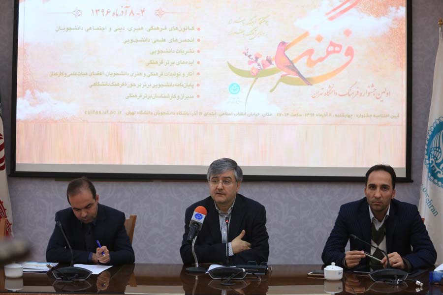 نشست خبری نخستین جشنواره فرهنگ دانشگاه تهران با حضور معاون فرهنگی و مدیر کل فرهنگی و اجتماعی دانشگاه تهران، سه شنبه 30 آبان در تالار امیر کبیر معاونت فرهنگی دانشگاه تهران، برگزار شد.