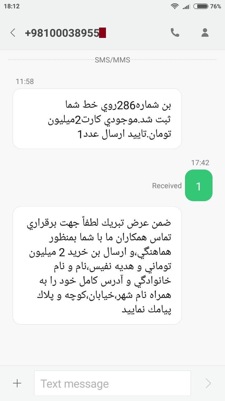 پیامهایی با این مضمون اغلب از طرف فروشندههای بدون مغازه یا افراد سودجو و کلاهبرداران دیگر صورت میگیرد. متن پیام به صورتی است که شما را وسوسه میکند. در زیر متن پیام به همراه نمونهای از آن را مشاهده میکنید: