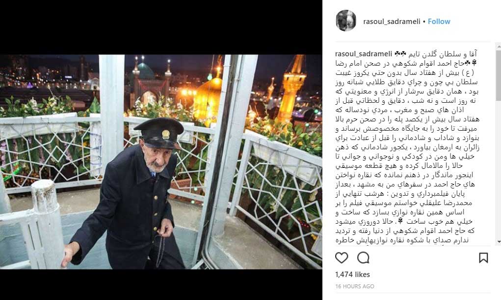 به گزارش جام جم آنلاین رسول صدرعاملی، کارگردان سینما که تجربه ساخت فیلم هایی را در مشهد داشته، در پی درگذشت حاج احمد اقوام شکوهی، نقارهزن حرم مطهر امام رضا (ع) در اینستاگرام نوشت: «آقا و سلطان گلدنتایم