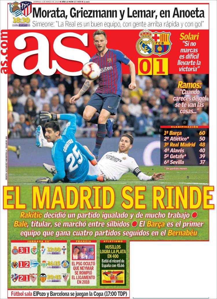 نشریه آ.اس نیز با تیتر "مادرید تسلیم شد"، به نتایج ضعیف و اخیر رئال مادرید در ال کلاسیکو اشاره کرده است.