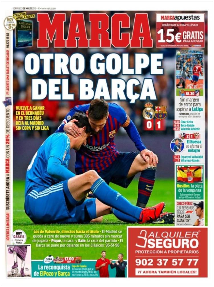 مارکا با تیتر "ضربه جدید بارسلونا"، به شکست های متوالی رئال مادرید برابر بارسلونا اشاره کرده است.