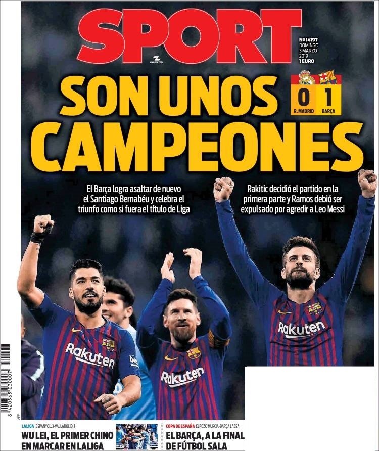 اما نشریه کاتالونیایی اسپورت از تیتر "آنها قهرمان هستند" استفاده کرده و این اشاره ای به عملکرد فوق العاده بارسا در سانتیاگو برنابئو بوده است.