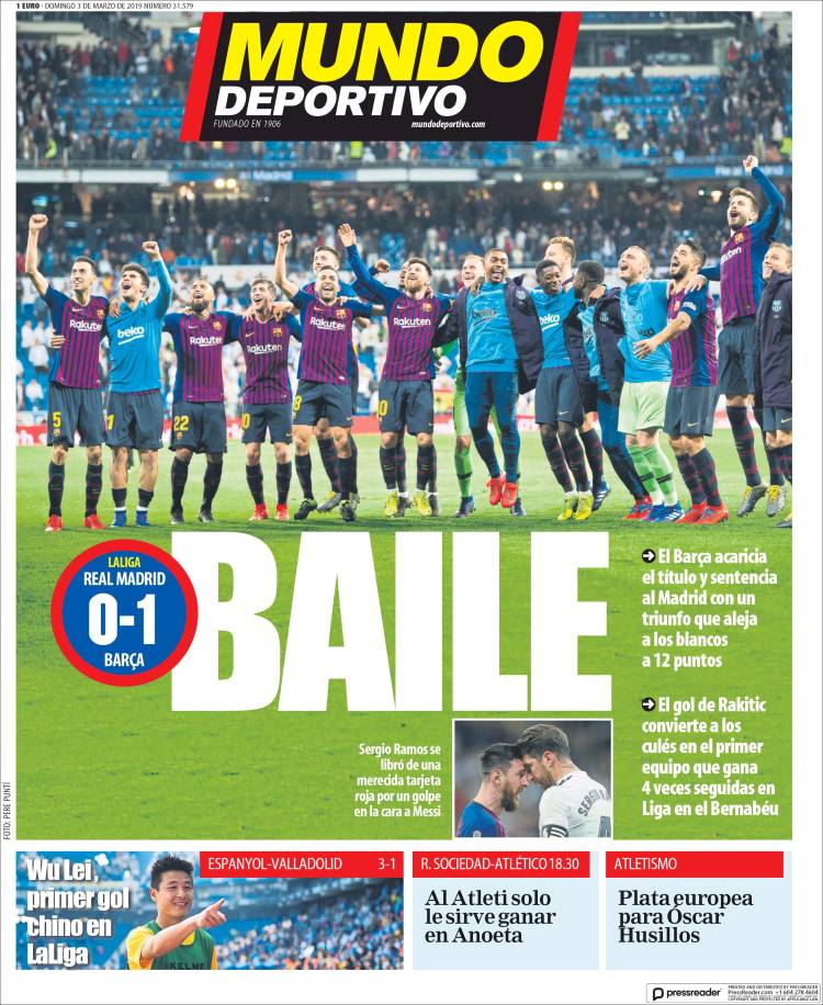 همچنین دیگر نشریه کاتالونیا یعنی موندو دیپورتوو نیز با تیتر"رقص(در برنابئو)" ، تصویری از جشن بارسا بعد از پیروزی را منتشر کرده است.