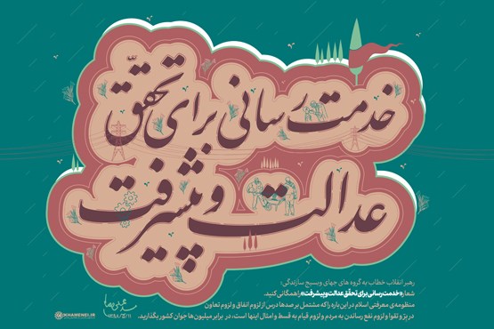 رابعاً: شعار «خدمترسانی برای تحقّق عدالت و پیشرفت» را همگانی کنید. منظومه معرفتی اسلام در اینباره را که مشتمل بر صدها درس از لزوم انفاق و لزوم تعاون در بِرّ و تقوا و لزوم نفع رساندن به مردم و لزوم قیام به قسط و امثال اینها است، در برابر میلیونها جوان کشور بگذارید.
