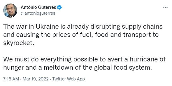 آنتونیو گوترش دبیرکل سازمان ملل متحد در پی وقوع و ادامه جنگ اوکراین نسبت به بروز اختلال در چرخه تامین مواد ضروری از جمله مواد غذایی ابراز نگرانی کرد و آنرا موجب فروپاشی در سیستم عرضه مواد غذایی در عرصه جهانی دانست.