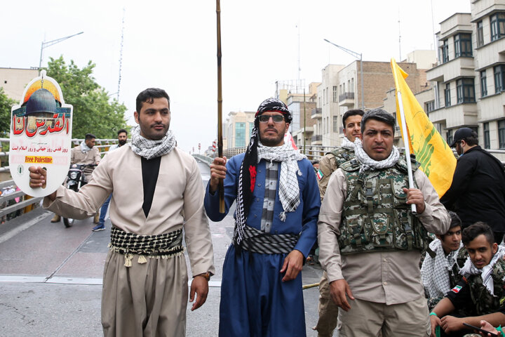 ۱۰:۳۰ - گروههای مختلفی از مردم یمن و افغانستان، همپای مردم ایران در چهارراه ولیعصر تهران حضور یافتهاند. تصویر شیخ زکزاکی، رهبر شیعیان نیجریه و نیز طرحنگارهی «شیخ احمد یاسین» از مبارزان برجسته مقاومت فلسطین در حاشیه راهپیمایی روز قدس هم از دیگر صحنههایی است که پازل مقاومت جهانی در برابر زیادهخواهیهای نظام سلطه را درخیابانهای تهران تکمیل کرده است.