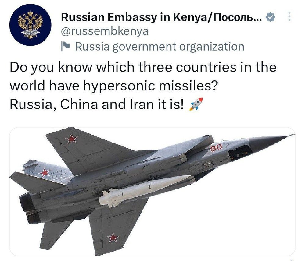 سفارت روسیه در کنیا یک بار دیگر جنجال بر سر موشکهای هایپرسونیک را به اوج رساند. ادعای بزرگ این سفارتخانه در توییتی که همزمان با رزمایش مشترک ایران ، چین و روسیه در خلیج فارس و دریای عمان برگزار می شود حسابی خبرساز شده است.