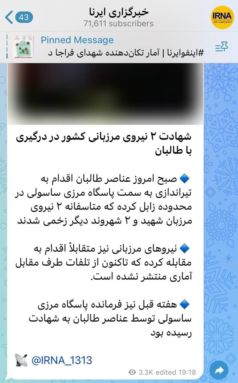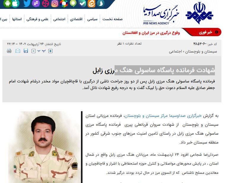 - در خبر ۶ خرداد، فرمانده پاسگاه مرزی ساسولی، هفته قبل توسط عناصر طالبان به شهادت رسیدهاست.