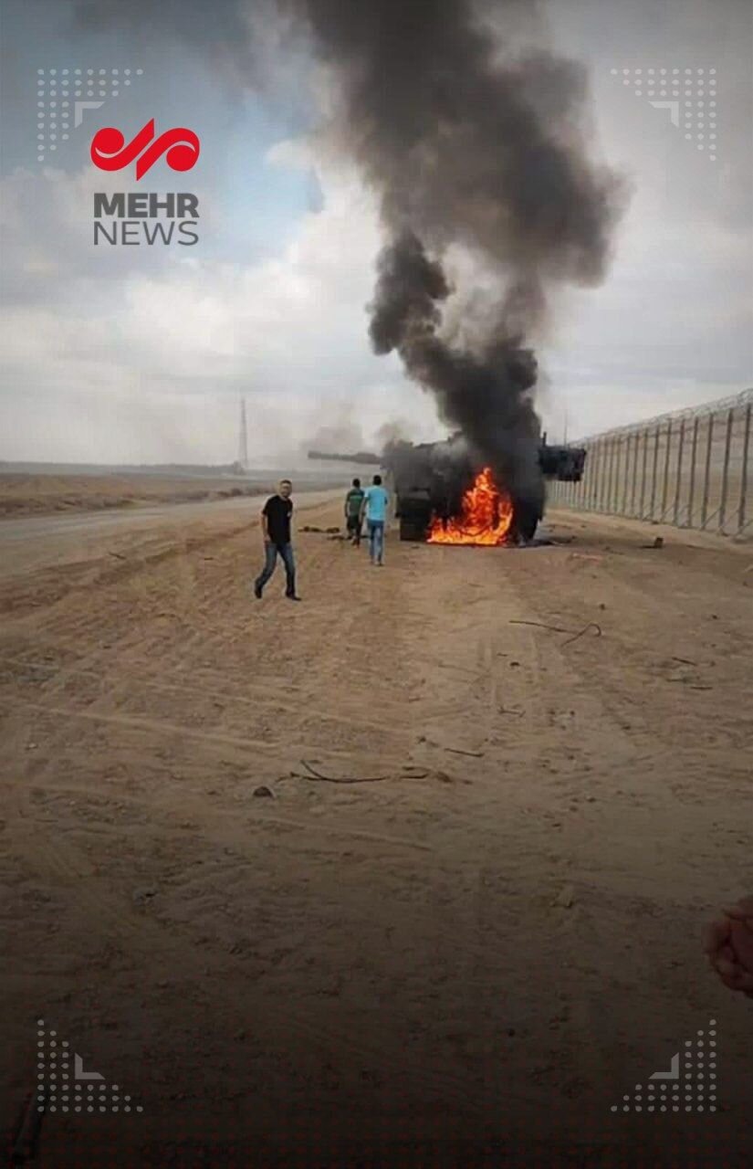 فلسطینی ها در برابر یکی از تانک های ارتش رژیم صهیونیستی که در جریان عملیات امروز نیروهای مقاومت منهدم شده عکس یادگاری گرفتند.