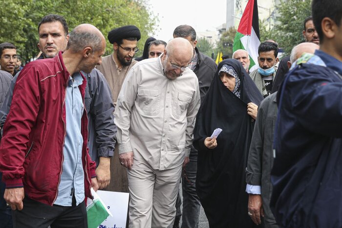 محمدباقر قالیباف رییس قوه مقننه نیز در راهپیمایی حمایت از مردم فلسطین حضور یافت.