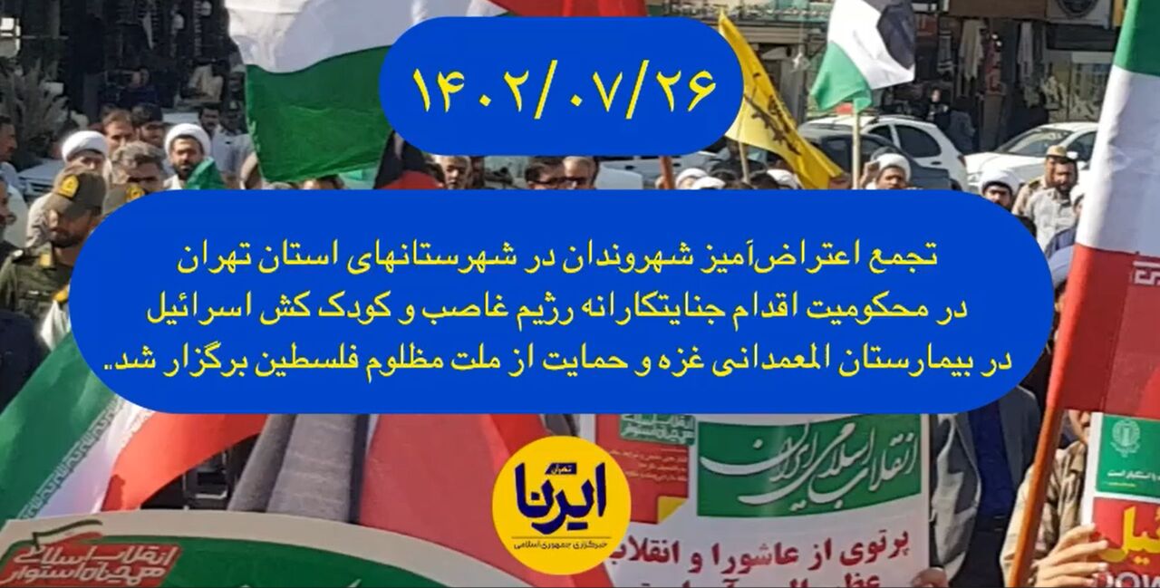 به گزارش ایرنا ، شهروندان شهرستانهای استان تهران روز چهارشنبه با تجمع اعتراضآمیز شهروندان اقدام جنایتکارانه رژیم غاصب و کودک کش اسرائیل در بیمارستان المعمدانی غزه را محکوم کرده و از ملت مظلوم فلسطین برابر این اقدامات دد منشانه حمایت کردند.