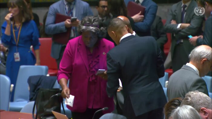 لیندا توماس گرینفیلد سفیر و نماینده آمریکا در سازمان ملل که کشورش به این قطعنامه رای ممتنع داد، برخی از اعضای شورا را به دلیل امتناع از محکومیت حماس سرزنش و تاکید کرد که حماس این درگیری را به راه انداخت.