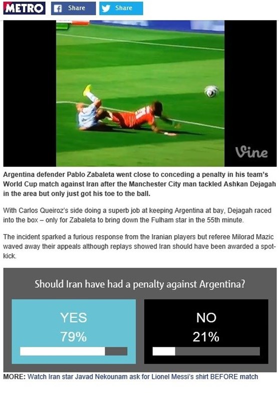 به گزارش خبرگزاری تسنیم، سایت روزنامه «مترو» انگلیس در خصوص خطایی که پابلو زابالتا، مدافع آلبیسلسته در دقیقه 55 روی اشکان دژاگه، بازیکن تیم ملی کشورمان در محوطه جریمه انجام داد نظرسنجی را با عنوان «آیا داور باید برای ایران در بازی با آرژانتین پنالتی میگرفت؟» انجام داد. 79 درصد کاربران این سایت بر این باور بودند که داور باید به سود ایران پنالتی میگرفت.