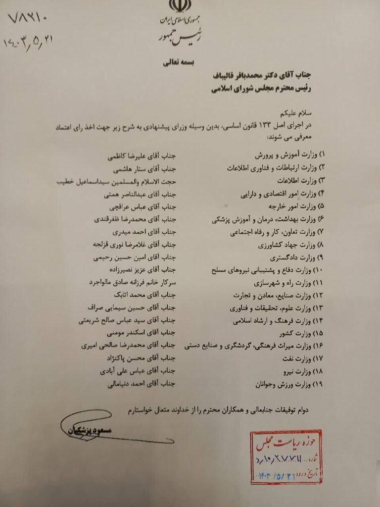 به گزارش خبرنگار مهر، محمدباقر قالیباف رئیس مجلس شورای اسلامی در جلسه علنی امروز (یکشنبه ۲۱ مرداد ماه) متن نامه معرفی وزرای پیشنهادی دولت چهاردهم را به شرح زیر قرائت کرد: