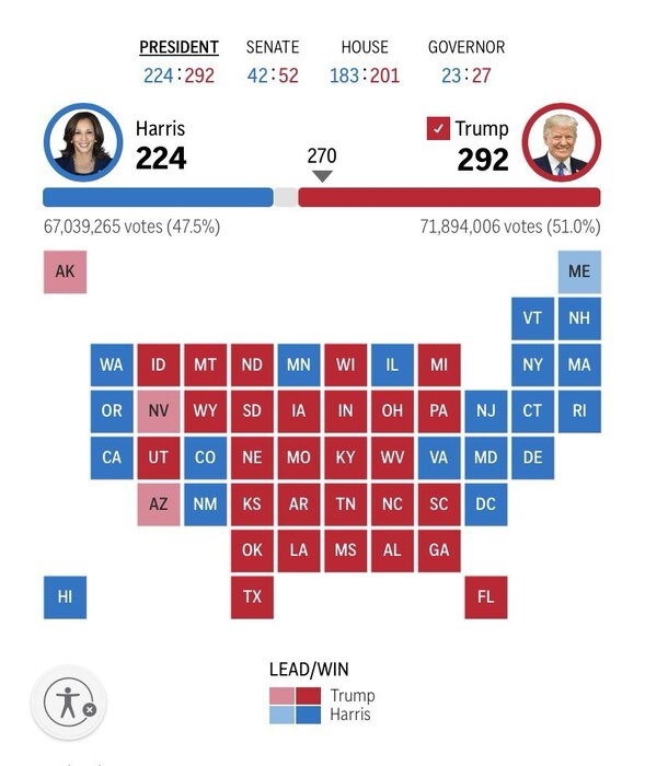ترامپ ۱۹۸ رای الکترال در ۲۰ ایالت کسب کرده است و هریس ۹۹ رای الکترال در ۹ ایالت به دست آورده است.