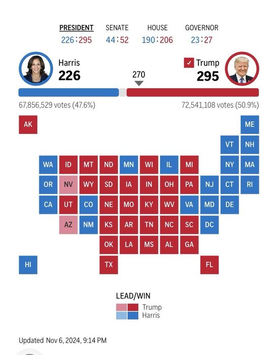 آرای الکترال ترامپ از ۱۲۰ رای الکترال به ۱۳۷ رای الکترال رسید و او همچنان از رقیبش کامالا هریس که تاکنون ۹۹ رای الکترال کسب کرده، پیشتاز است.