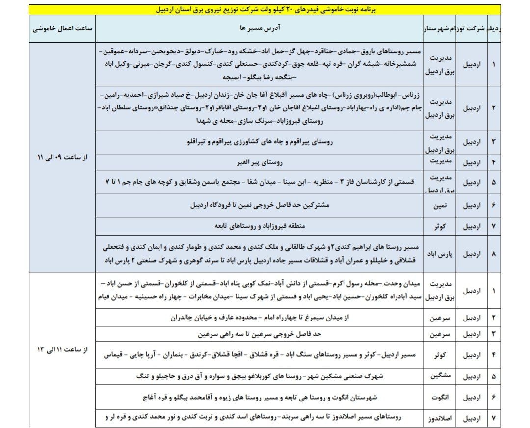 به گزارش خبرگزاری صداوسیما، مرکز اردبیل شرکت توزیع نیروی برق استان در اطلاعیهای جدول زمانبندی اعمال خاموشی در نقاط مختلف این استان از ساعت ۹ تا ۱۷ در روز شنبه 26 آبان را اعلام کرد.