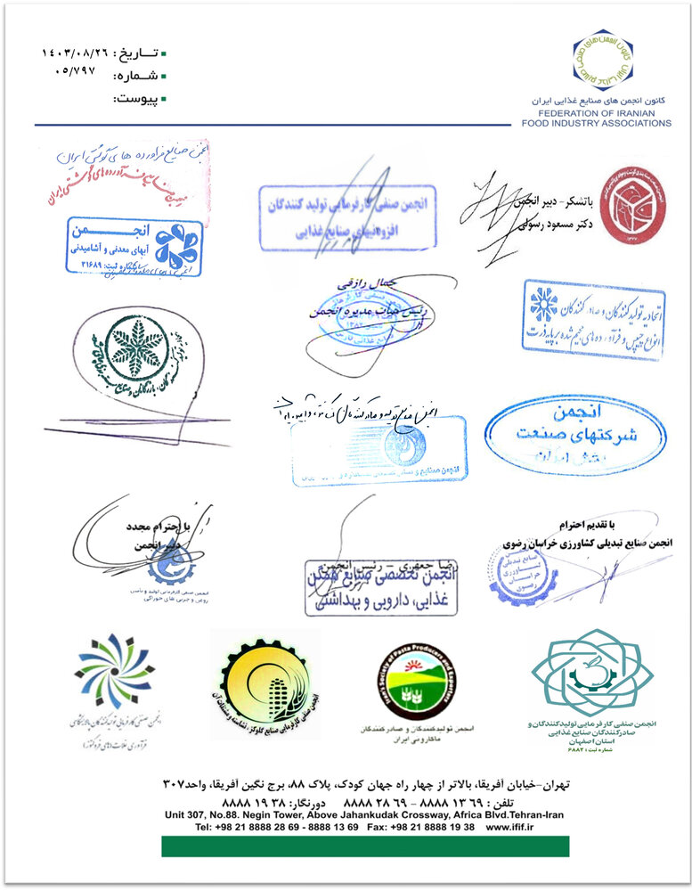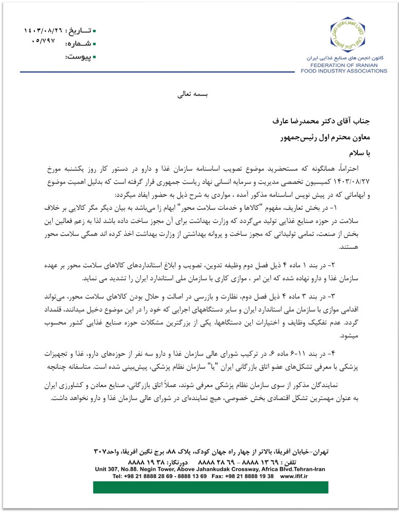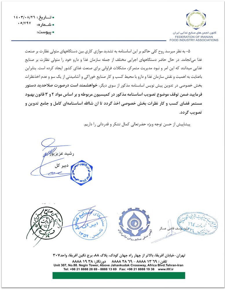 ۵- به نظر می رسد روح کلی حاکم بر این اساسنامه به تشدید موازی کاری بین دستگاههای متولی نظارت بر صنعت غذا میانجامد. در حال حاضر دستگاههای اجرایی مختلف از جمله سازمان غذا و دارو خود را متولی نظارت بر صنایع غذایی میدانند که این امر و نبود مدیریت متمرکز، مشکلات فراوانی برای صنعت غذای کشور ایجاد کرده است. بنابراین باعنایت به اهمیت و نقش سازمان غذا و دارو با محیط کسب و کار صنایع خوراکی و آشامیدنی از یک سو و عدم اخذنظرات بخش خصوصی در تدوین پیش نویس اساسنامه مذکور از سوی دیگر، خواهشمند است درصورت صلاحدید دستور فرمایید ضمن توقف موضوع تصویب اساسنامه مذکور در کمیسیون مربوطه و بر اساس مواد ۲ و ۳ قانون بهبود مستمر فضای کسب و کار نظرات بخش خصوصی اخذ گردد تا ان شاالله اساسنامهای کامل و جامع تدوین و تصویب گردد.