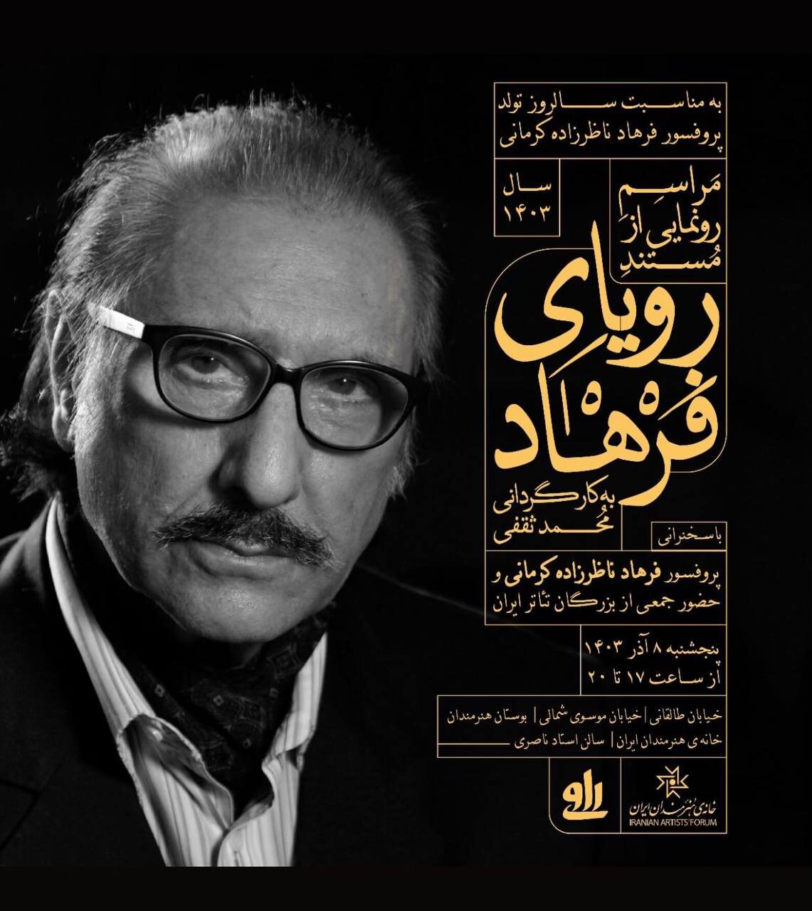 مستند رویای فرهاد روایتی از زندگی این استاد هنرهای نمایشی است که به کارگردانی محمد ثقفی تهیه شده و پنجشنبه هشتم آذرماه ۱۴۰۳ در سالن استاد ناصری خانه هنرمندان و به مناسبت تولد ایشان به نمایش در خواهد آمد.