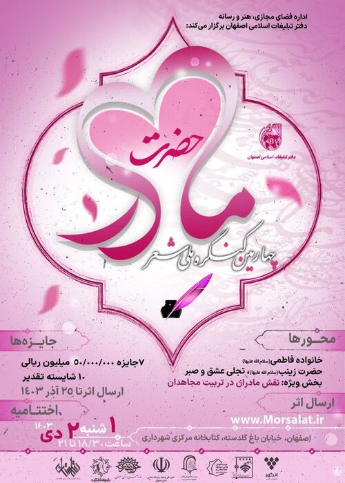 به گزارش ایرنا، چهارمین کنگره ملی شعر حضرت مادر در محورهای خانواده فاطمی، حضرت زینب (س) تجلی عشق و صبر و نقش مادران در تربیت مجاهدان برگزار میشود.