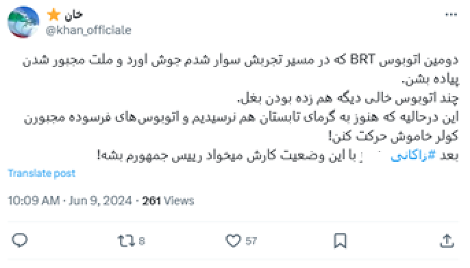 ۱. انتشار بیش از ۶ هزار و ۵۲۲ توئیت در بازه زمانی ۸ ماهه که بیش از ۱۹۷ هزار و ۱۲۳ لایک گرفتهاند، نشان میدهد علاوه بر اینکه مشکلات بی.آر.تی به عنوان یک موضوع پردغدغه در میان مردم مطرح بوده، ایکس فارسی نیز محلی برای ابراز نظر، دغدغهها و حتی دردلها و گلایههای کاربران مجازی به شمار میرود که در موضوعهای اجتماعی بیشتر نمود داشته است.