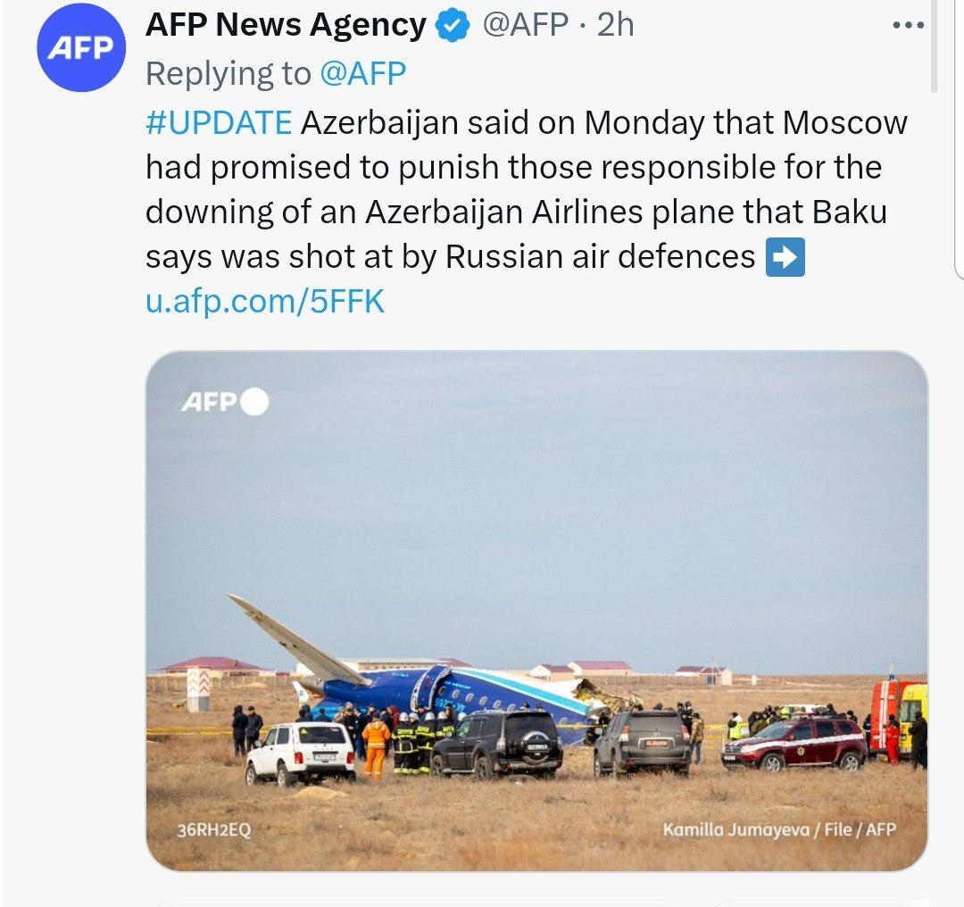 مقامات آذربایجان اعلام کردند مسکو قول داده است که مسئولین سرنگونی هواپیمای خطوط هوایی آذربایجان را که به گفته باکو توسط پدافند هوایی روسیه هدف قرار گرفت، مجازات کند.