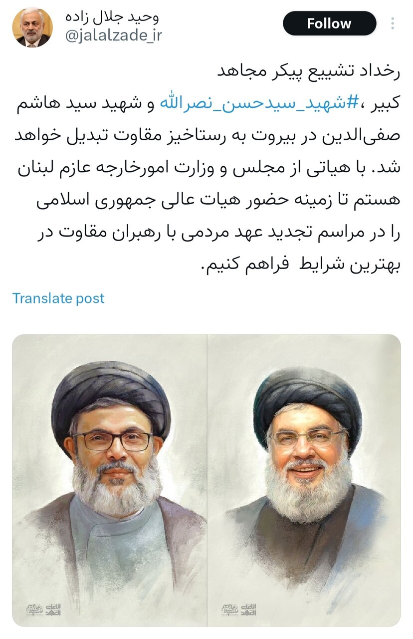 به گزارش خبرگزاری ایمنا، وحید جلال زاده، معاون کنسولی، مجلس و ایرانیان وزارت امور خارجه در حساب ایکس خود نوشت: «رخداد تشییع پیکر مجاهد کبیر، شهید سیدحسن نصرالله و شهید سید هاشم صفیالدین در بیروت به رستاخیز مقاومت تبدیل خواهد شد. با هیئتی از مجلس و وزارت امورخارجه عازم لبنان هستم تا زمینه حضور هیأت عالی جمهوری اسلامی را در مراسم تجدید عهد مردمی با رهبران مقاومت در بهترین شرایط فراهم کنیم.»