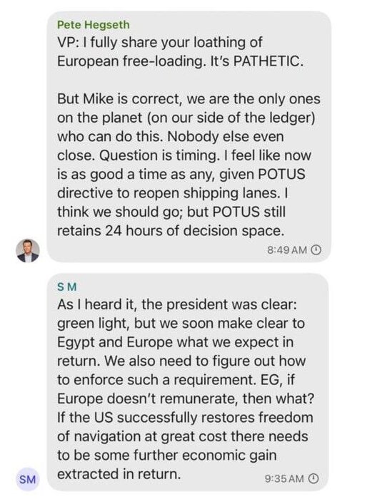 به گفته او، در بخشی از پیامهای ردوبدل شده، معاون ترامپ و وزیر دفاع آمریکا به انتقاد از اروپا پرداخته و تاکید کردهاندکه ایالات متحده آمریکا تنها کشوری است که میتواند آزادی تردد دریایی در دریای سرخ را تأمین کند.