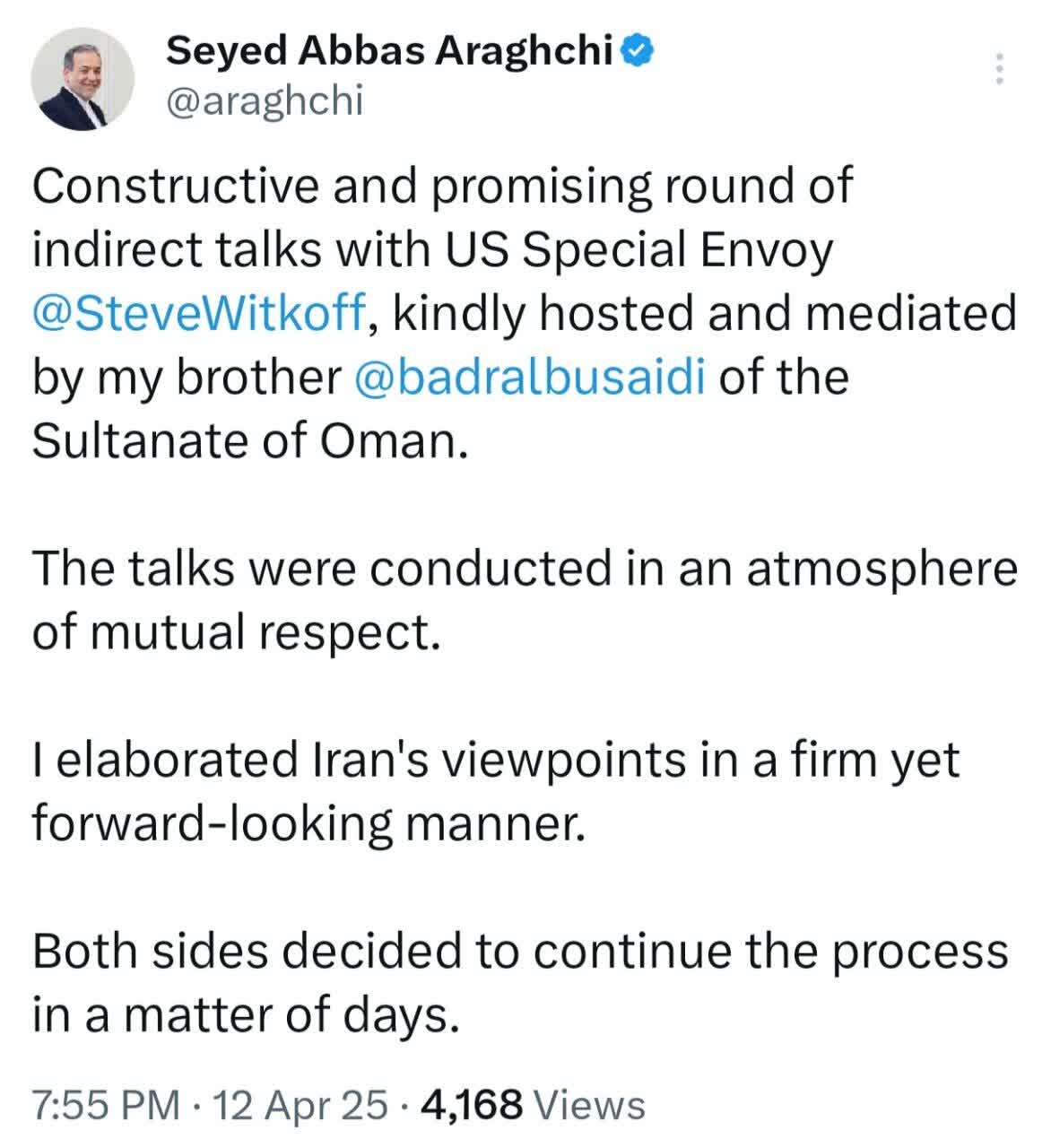 به گزارش خبرگزاری ایمنا، «سید عباس عراقچی» وزیر امور خارجه جمهوری اسلامی ایران روز شنبه و در پایان گفتوگوهای غیرمستقیم ایران و آمریکا در مسقط نوشت: دور اول مذاکرات غیرمستقیم با فرستاده ویژه ایالات متحده آقای ویتکاف، با میزبانی و میانجیگری برادرم جناب "بدر البوسعیدی" از سلطنت عمان سازنده و امیدوارکننده بود.