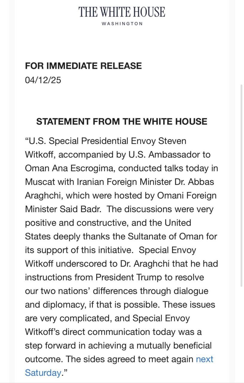 در بیانیه کاخ سفید آمده است: «استیون ویتکاف، فرستاده ویژه ریاست جمهوری آمریکا به همراه آنا اسکروجینا، سفیر آمریکا در نشستی در مسقط با دکتر عباس عراقچی وزیر امور خارجه ایران که به میزبانی بدر البوسعیدی وزیر امور خارجه عمان برگزار شد، گفتوگو کرد.»