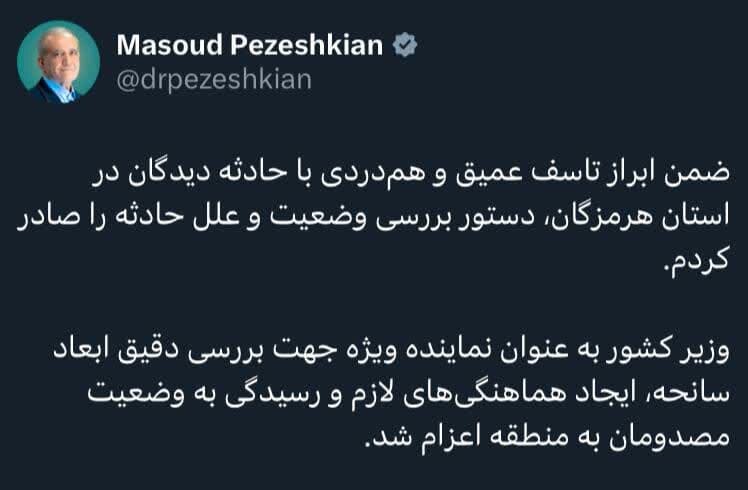 حساب کاربری مسعود پزشکیان در شبکه اجتماعی ایکس نوشت: «ضمن ابراز تأسف عمیق و همدردی با حادثهدیدگان در استان هرمزگان، دستور بررسی وضعیت و علل حادثه را صادر کردم.»
