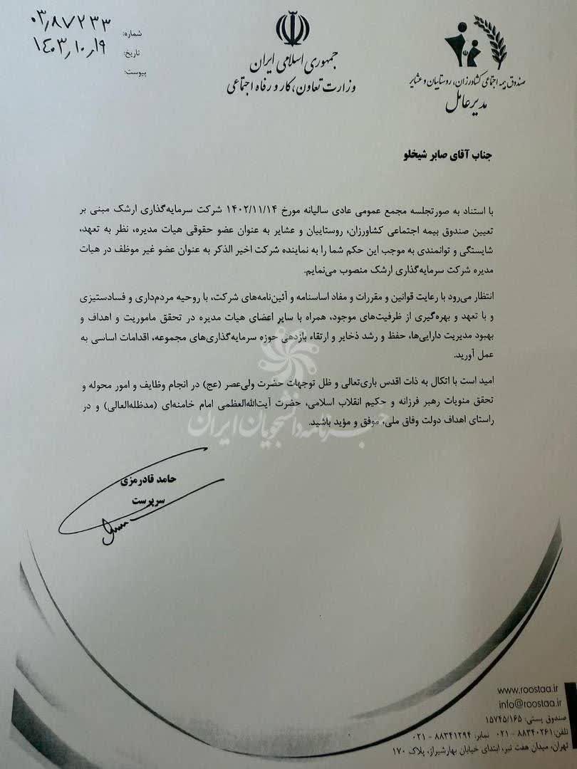 به گزارش «خبرنامه دانشجویان ایران»؛ بر اساس نامهای که از سوی سازمان بازرسی کل کشور منتشر شده، انتصاب آقای صابر شیخلو، معاون مالی صندوق بیمه اجتماعی، به عضویت هیئت مدیره شرکت ارشک (یکی از شرکتهای زیرمجموعه صندوق بیمه اجتماعی) با موقعیت تعارض منافع احراز گردیده است. این موضوع باعث ایجاد نگرانی در خصوص تضاد منافع و احتمال سوء استفاده از موقعیتهای شغلی آقای شیخلو شده است.
