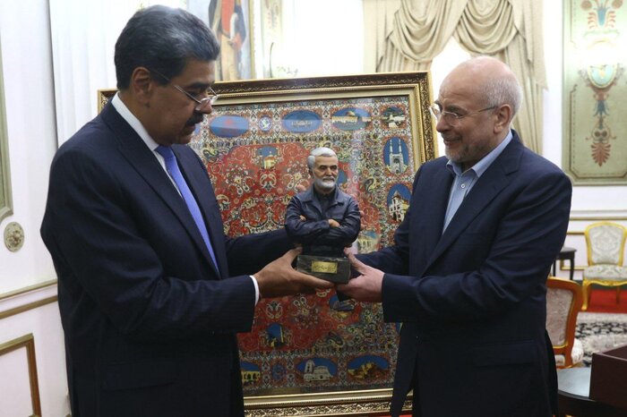رئیس مجلس شورای اسلامی در دیدار با رئیس جمهوری ونزوئلا، تندیسی از شهید سلیمانی را که خانواده حاج قاسم برای مادورو ارسال کرده بود، تقدیم وی کرد.