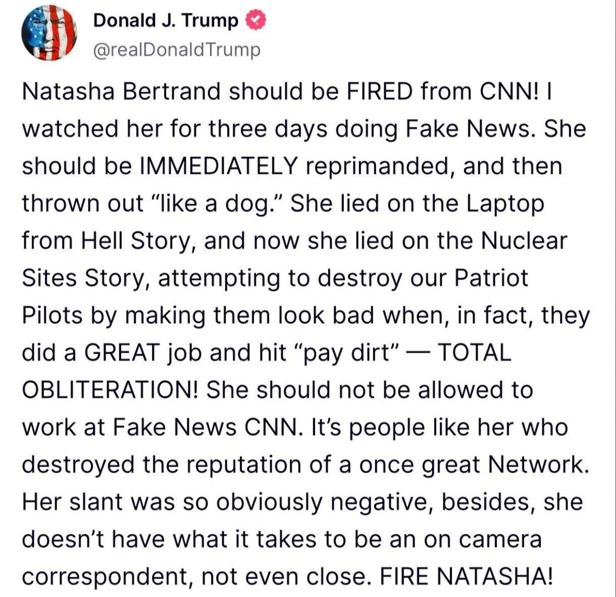 به گزارش جماران؛ دونالد ترامپ نوشت: ناتاشا برتراند باید از سیانان اخراج شود! او سه روز اخبار جعلی پخش کرد. باید فوراً توبیخ و «مثل سگ» اخراج شود.