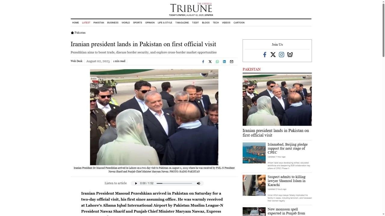دیگر روزنامه پاکستانی «اکسپرس تریبیون» (The Express Tribune) نیز در پوشش خبری سفر پزشکیان، با تیتر «رئیس جمهور ایران در اولین سفر رسمی خود وارد پاکستان شد» به ابعاد این سفر ۲ روزه پرداخت.