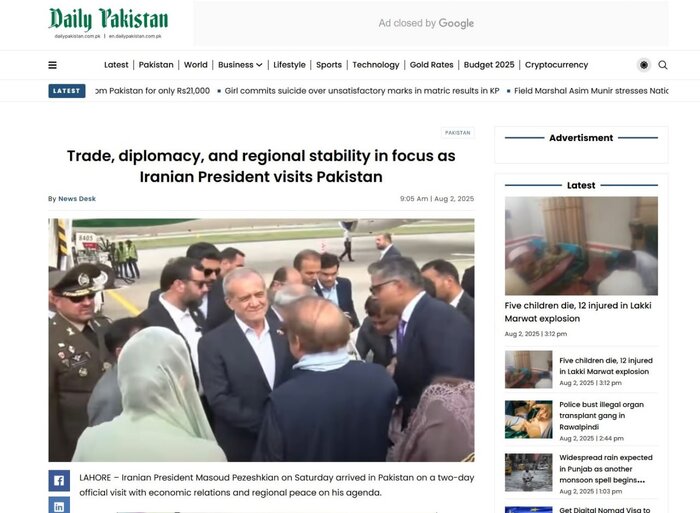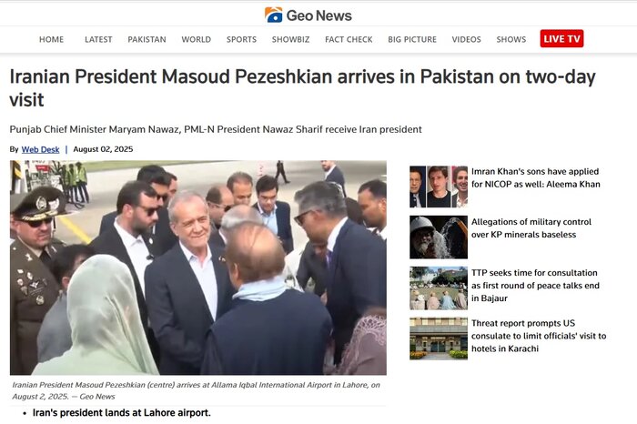 تارنمای اکسپرس تریبیون نوشت: مسعود پزشکیان، رئیس جمهوری ایران، روز شنبه (امروز) برای یک سفر رسمی ۲ روزه، که اولین سفر او از زمان تصدی این سمت است، وارد پاکستان شد.