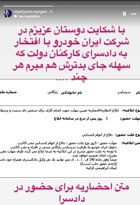 ساعاتی پیش، رایگانی مدیرکل تعزیرات حکومتی کشور با انتشار استوری در اینستاگرام از شکایت ایران خودرو علیه خود در دادسرای کارکنان دولت به دلیل نشر اکاذیب خبر داد و نوشت: با افتخار، به دادسرای کارکنان دولت و سختتر از آنجا هم خواهم رفت.