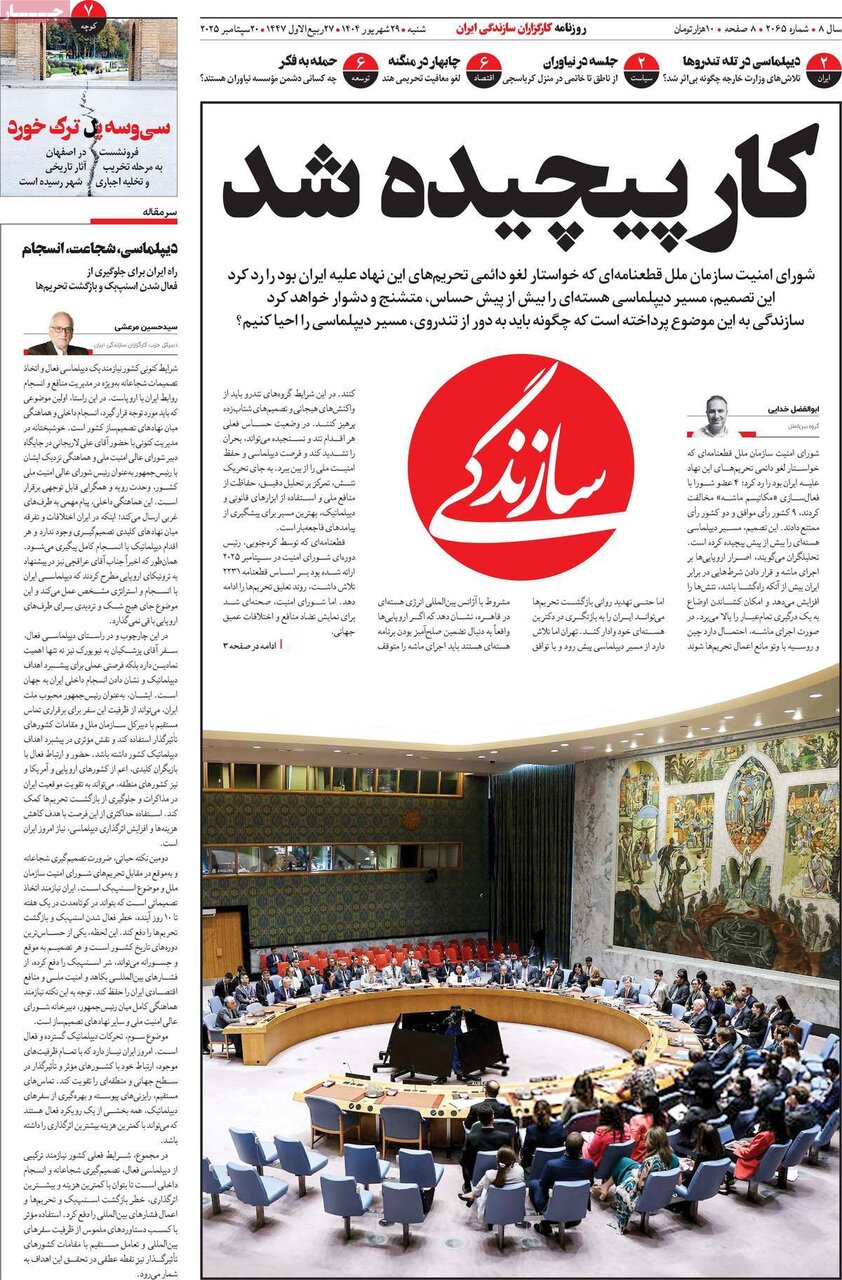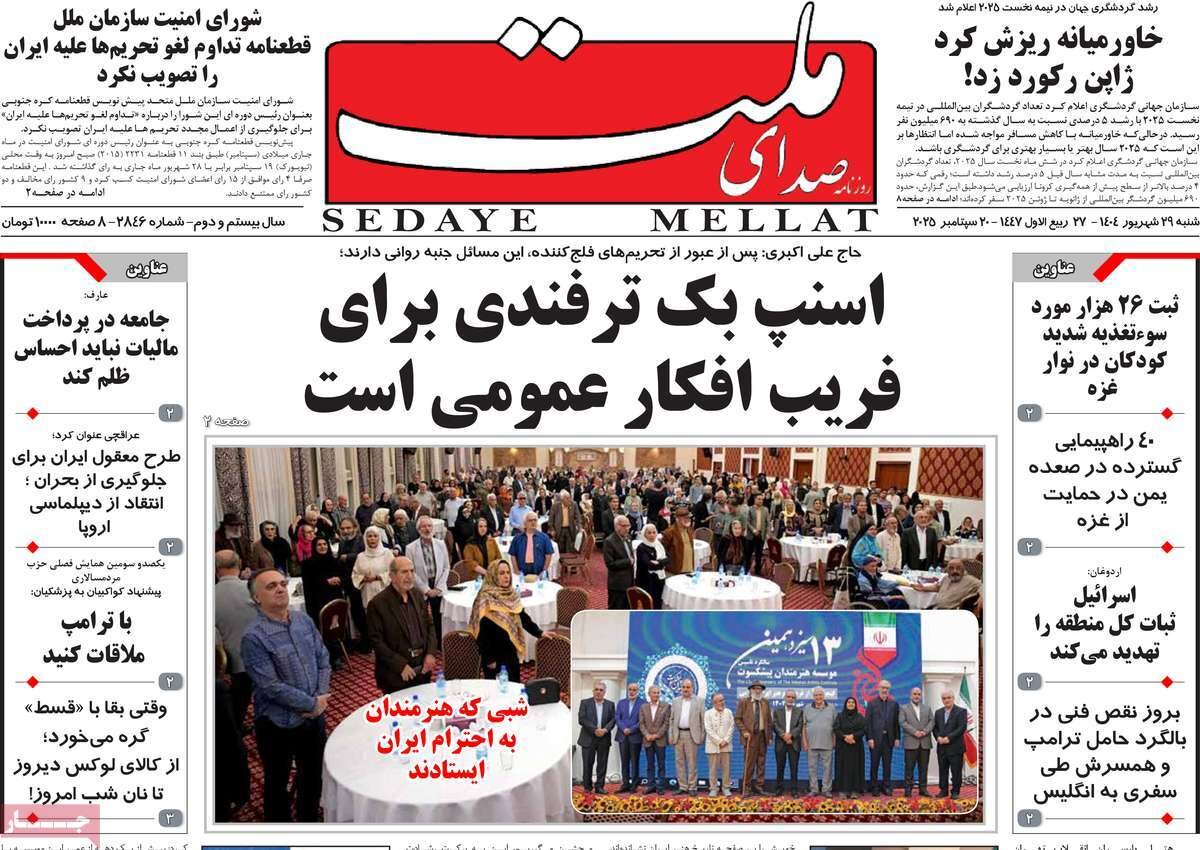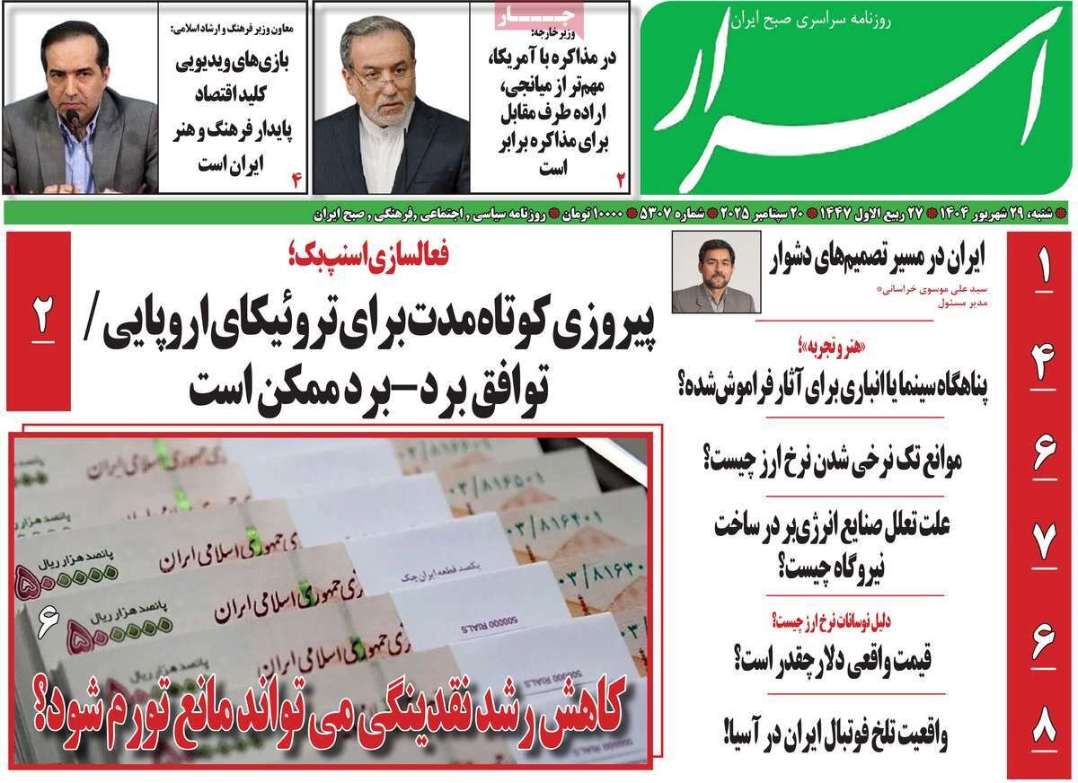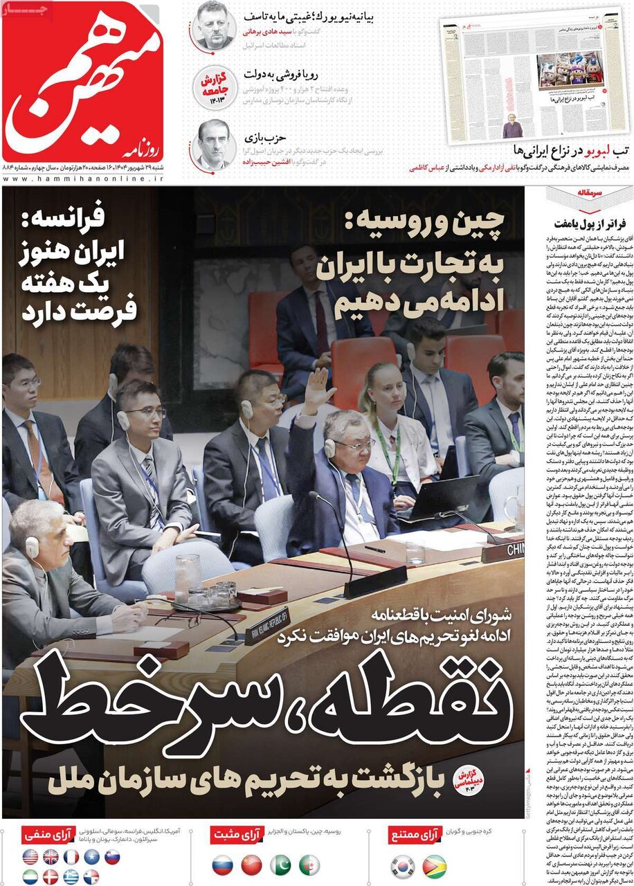 شنبه ۲۹ شهریور ۱۴۰۴ - ۰۸:۴۵ شناسهٔ خبر: 74924701 - سرویس سیاسی نسخه قابل چاپ منبع: مهر | لینک خبر روزنامههای صبح شنبه ۲۹ شهریور ۱۴۰۴ روزنامه های صبح امروز درباره بازگشت تحریم های سازمان ملل نوشتند. صاحبخبر - ∎