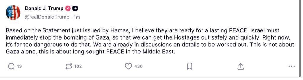 «بر اساس بیانیهای که حماس همین الان منتشر کرد، من معتقدم که آنها برای صلح پایدار آماده هستند. اسرائیل باید فوراً بمباران غزه را متوقف کند تا ما بتوانیم گروگانها را به سرعت و ایمن آزاد کنیم! در حال حاضر، انجام این کار بسیار خطرناک است. ما در حال حاضر در حال بحث در مورد جزئیاتی هستیم که باید بررسی شوند. این فقط مربوط به غزه نیست، این مربوط به صلحی است که مدتهاست در خاورمیانه به دنبال آن هستیم.»