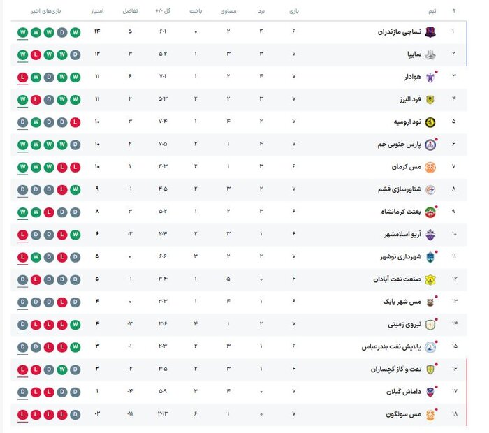 نساجی که تا پایان هفته ششم شانه به شانه هوادار تهران بالانشین جدول بود و به دلیل تفاضل گل کمتر در رتبه دوم جدول قرار داشت، با صدور حکم کمیته انضباطی فدراسیون فوتبال و کسر سه امتیاز از تیم هوادار در روزهای اخیر صدر جدول لیگ دسته یک را در اختیار گرفت. این تیم مازندرانی حالا نیز با توجه به شکست هوادار که منجر به پایینتر رفتن این تیم در جدول و قرار گرفتنش در رتبه سوم شد، به دنبال افزایش فاصله خود با تیمهای نزدیک به صدر جدول است.