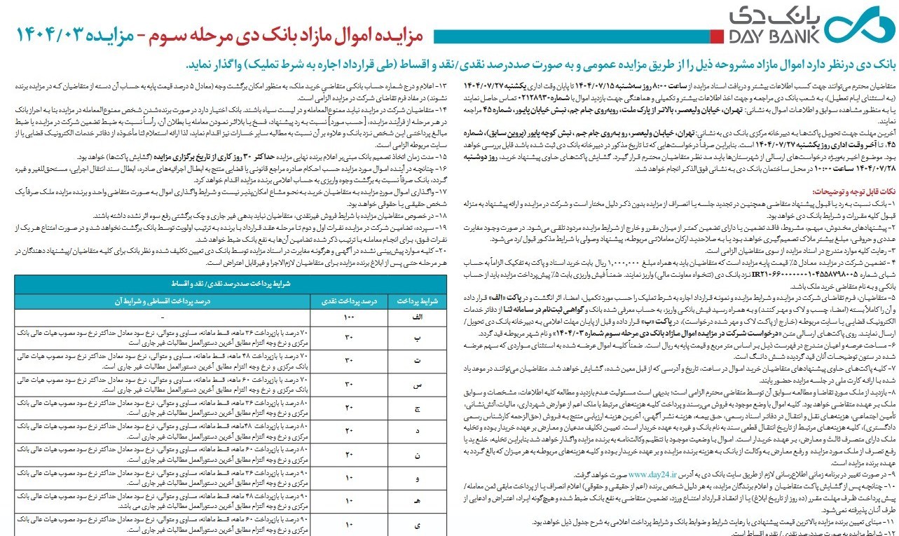 در مزایده جدید بانک دی هم شرایط پرداخت 100 درصد نقد و هم شرایط پرداخت 30 درصد 20 درصد و 10 درصد نقد با بازپرداخت 36 یا 48 یا 60 ماهه به صورت اقساط ماهانه در نظر گرفته شده است.