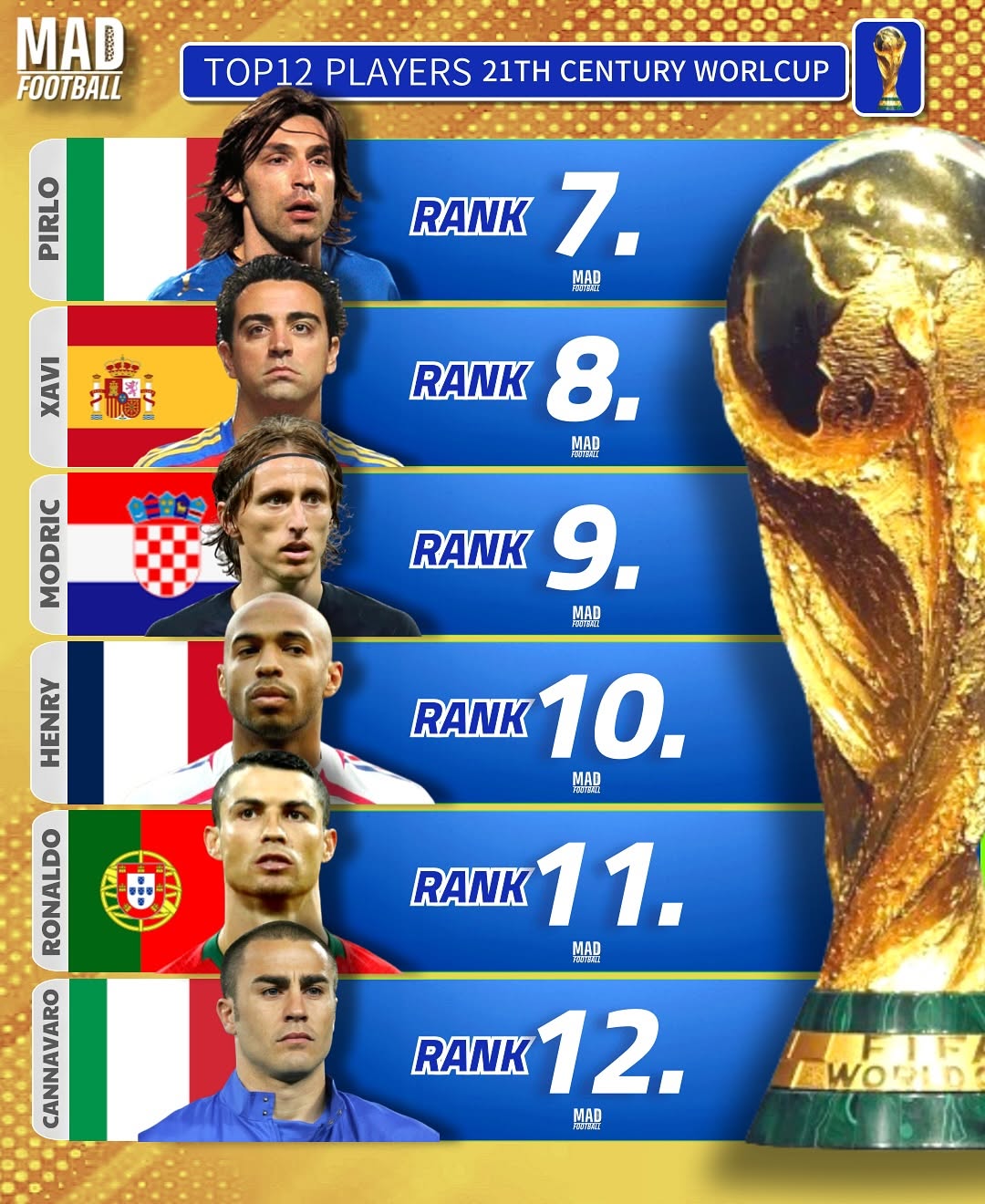 رتبهی دهم به تیری آنری (Thierry Henry) تعلق دارد، ستارهی فرانسوی که در قهرمانی ۱۹۹۸ نقشی مهم ایفا کرد. در ردهی یازدهم کریستیانو رونالدو (Cristiano Ronaldo) از پرتغال قرار دارد که اگرچه تاکنون قهرمان جام جهانی نشده، اما عملکرد فردی او در چندین دوره، از جمله گلهای زیبا و رهبری تیم ملی پرتغال، غیرقابل انکار است. در نهایت، فابیو کاناوارو (Fabio Cannavaro) کاپیتان ایتالیا در جام جهانی ۲۰۰۶ و برندهی توپ طلای همان سال، جایگاه دوازدهم را به خود اختصاص داده است.