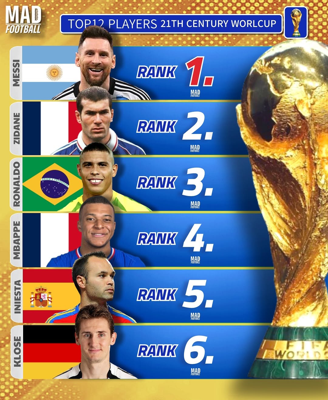 در این دو تصویر، رتبهبندی ۱۲ بازیکن برتر قرن بیستویکم در جام جهانی فوتبال (World Cup 21th Century) توسط صفحهی MAD Football نمایش داده شده است. این تصاویر که با طراحی جذاب و پسزمینهای طلایی از جام جهانی تزئین شدهاند، به معرفی بهترین فوتبالیستهایی میپردازند که در بیستویکمین قرن میلادی در جامهای جهانی عملکرد درخشانی داشتهاند. هر بازیکن با پرچم کشورش، نام و رتبهی دقیق خود نمایش داده شده است، و این طراحی باعث شده تا این عکسها از نظر بصری و اطلاعاتی برای علاقهمندان فوتبال بسیار جذاب باشند.