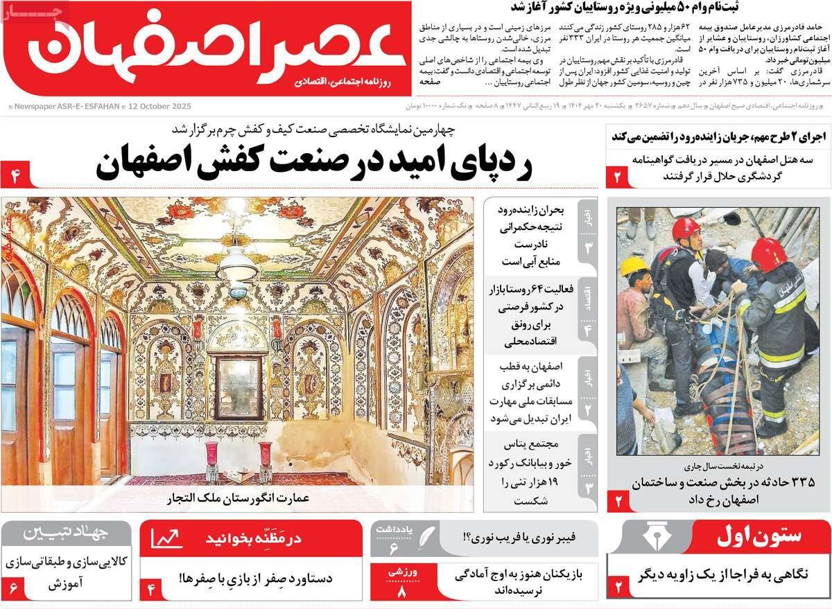 یکشنبه ۲۰ مهر ۱۴۰۴ - ۰۷:۵۸ شناسهٔ خبر: 75284812 - سرویس استانی نسخه قابل چاپ منبع: مهر | لینک خبر صفحه نخست روزنامههای اصفهان یکشنبه ۲۰ مهرماه صاحبخبر - ∎