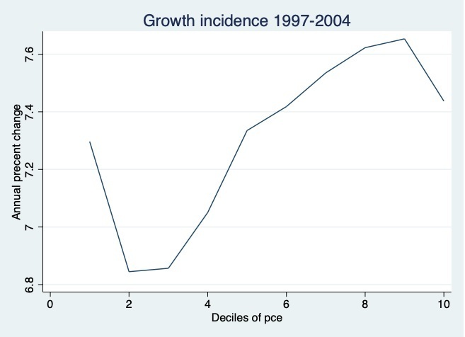 نرخ رشد اشتغال یا نرخ رشد درآمد به جز دهک پایین برای سایر دهکها شیب صعودی داشت. دوران ریاست جمهوری خاتمی شاهد شتاب رشد اقتصادی بود که از زمان سلف او آغاز شده بود، اما علیرغم وعدههای ارائه شده، ثمرات آن رشد به طور نامتناسبی به ثروتمندان رسید.