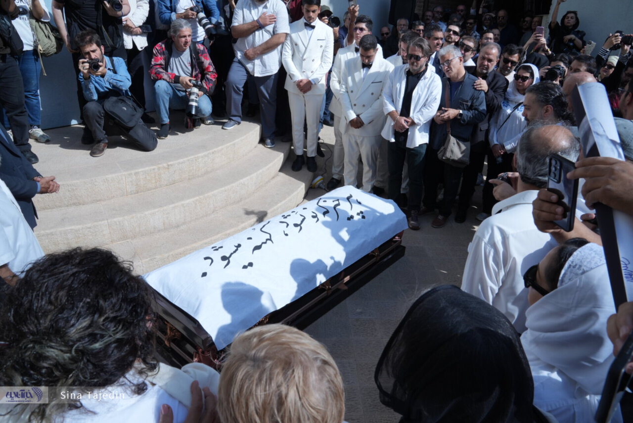 تابوت پیکر ناصر تقوایی بر دوش افرادی با کت و شلوار سفید در میان تشویق ممتد حاضران وارد حیاط خانه سینما شد. این وصیت خود ناصر تقوایی بود که حاضران با لباس سفید او را تشییع کنند.