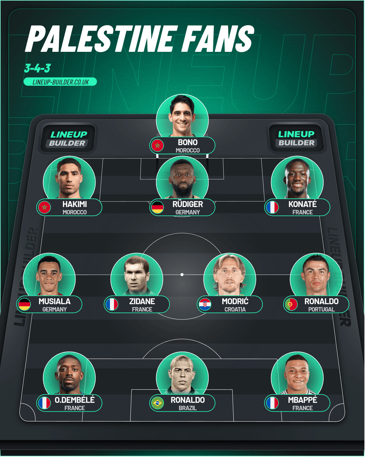تیم فلسطین برتر است (امباپه، رونالدو نازاریو، دمبله، رودیگر).